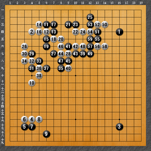 本局は、序盤の折衝で白の大石が取られてしまい、そこで大勢が決してしまいました。画像はそこまでの棋譜ですが、劣勢に陥った白による50のカカリが打ちすぎだったようで、黒51の封鎖から59まで。白の取られです。黒39が急所の一撃で、ここから一気に形勢が動いた感がありました。