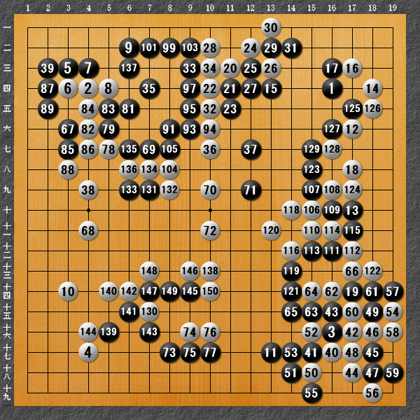 黒31はポン抜きの一手で、黒37は生きている石を逃げるつまらない手でした。その前段、黒35でようやく打たれた7の四。長かった……