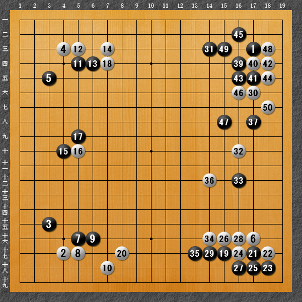 白38(黒1の左)は負けを早めた感じ。38では18の十にトビを打ち黒15の八にトビなら白14の十と黒33を取って我慢すべきです。